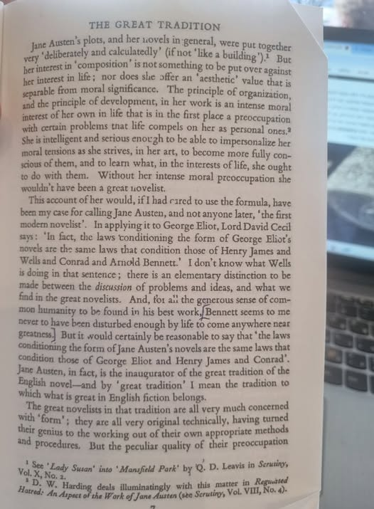 ליוויס נחשב מזה שני דורות בחקר הספרות "שמרן" שעבר זמנו (בשליש השני של המאה שעברה השפעתו הייתה גדולה מאד). והוא אכן עסוק מאד ב"גדולה" ספרותית וממיין סופרים לפי גדולתם. אך הוא עסוק מאד גם במוסר, כלומר במורכבות המוסרית שמציגה הספרות (תוך תיעוב כלפי המסורת הצרפתית הפלובריאנית של המבע ה"אובייקטיבי"!). על כל פנים מעניין לראות שלפי ה"שמרן" ליוויס, שתיים (!) מתוך ארבעת כותבי הרומנים הגדולים ביותר בספרות האנגלית הן נשים: ג'יין אוסטן וג'ורג' אליוט (שני הגברים הם ג'וזף קונרד והנרי ג'יימס, שליוויס מסביר מדוע הוא גם אנגלי, למרות אמריקאיותו).