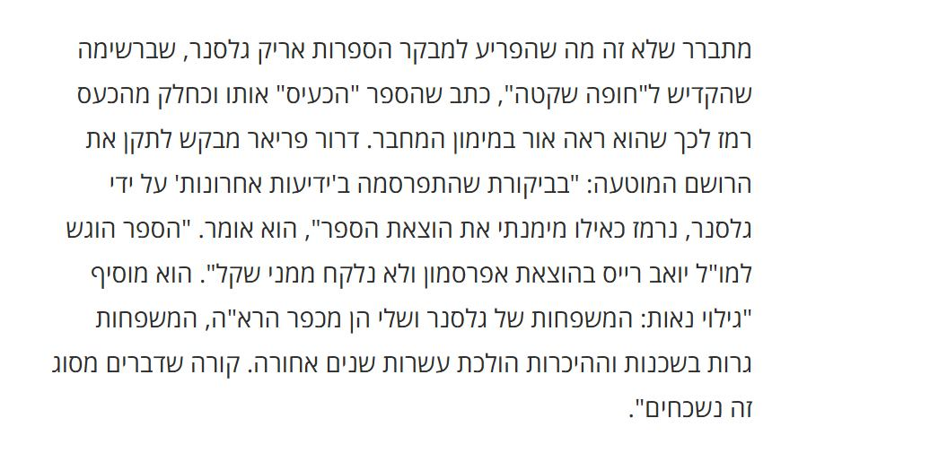 הסופר מעלה שתי טענות נגד הביקורת שלי: א. הביקורת שלי רמזה שספרו ראה אור במימון המחבר ולא כך הוא. ב. פריאר-דרור רומז שאני מכיר את משפחתו ואותו עשרות שנים וזו אולי הסיבה לביקורת המחמירה, מעין "חיסול חשבונות" בין בית קפולט לבית מונטגיו אשר בעמק חפר.
